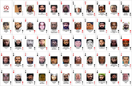 Deck of playing cards featuring the faces of 54 most wanted jihadi terrorists from around the world. Version 2 has been updated in 2017 to reflect new key terrorists and to remove those that have been killed or captured. Each card shows a different face along with their name and title. Just like the original most wanted deck produced by the US Defense Intelligence Agency (DIA) for Iraq, this deck is designed to enhance recognition of key terrorists. All faces are pulled from the IntelCenter Database (ICD).